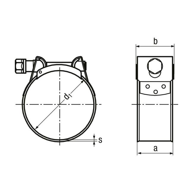 Schlauchbriden MIKALOR SUPRA W2 Ø 47 – 51 BN13907 für hohen Druck Band und Gehäuse: Inox X6Cr17/1.4016 Schraube / Mutter: Stahl 8.8 / 8 verzinkt nach DIN ISO Abmessungen siehe Zeichnung : d1: 47mm L: 51