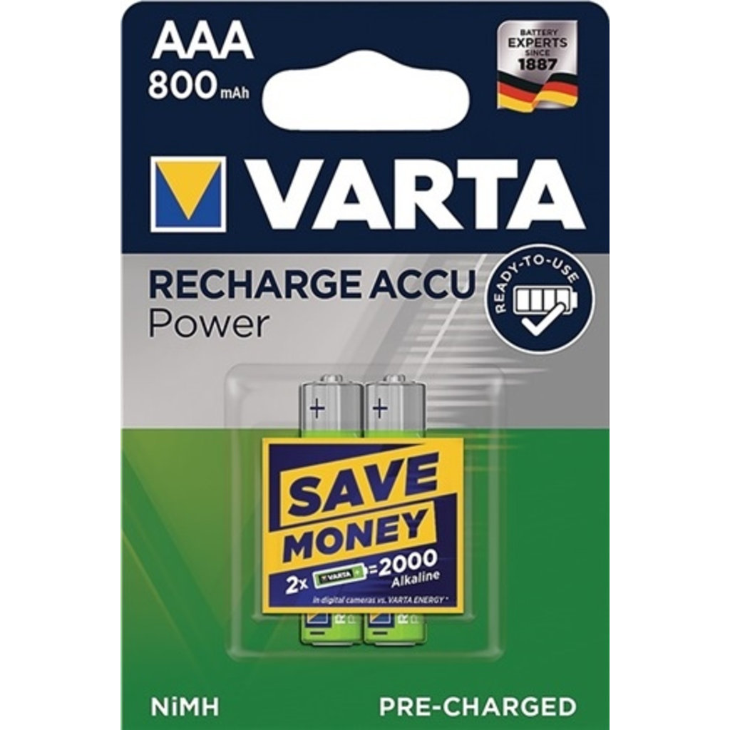 VARTA Batterie Recharge Accu Power AAA 800 mAh 2Stk. aufladbar mit allen gängigen Ladegeräten, wiederaufladbar mit Memory-Effekt, Ready To Use Technologie, diese Akkus sind ohne vorheriges Aufladen sofort einsatzbereit, sehr geringe Selbstentladung