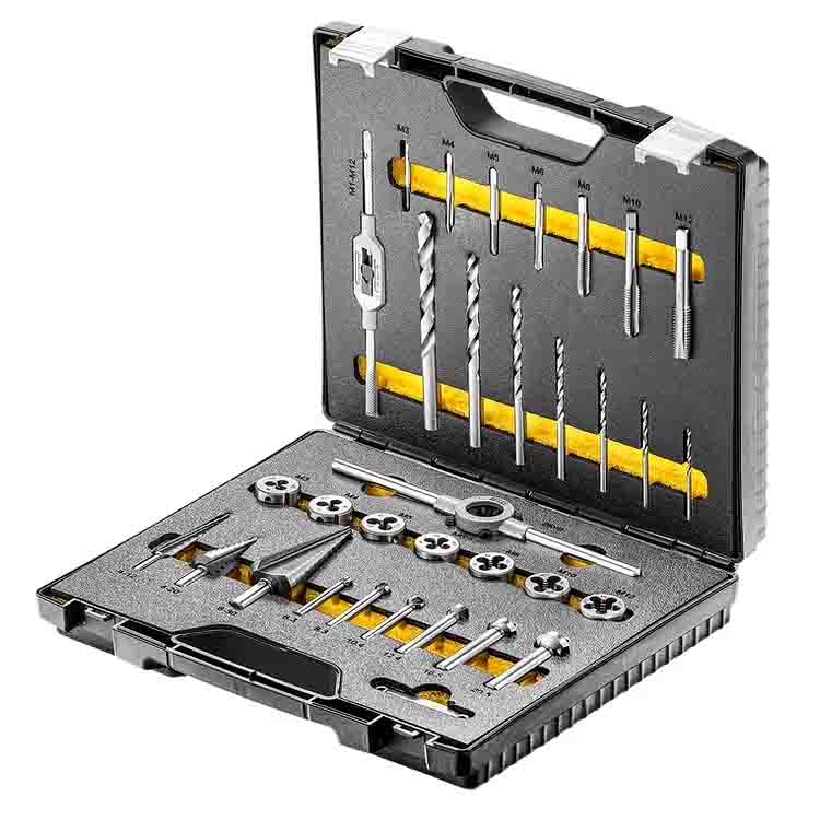 HSS-G Gewindeschneidwerkzeug Sätze aus geschliffenem Hochleistungs-Schnellarbeitsstahl. Komplette Sortimente zur Herstellung metrischer ISO-Regelgewinde von M3-M12 bzw. M20. Geeignet zum Schneiden von gewinden mit Hand in Stahlbleche und Aussengewinde an runden Werkstücken wie Bolzen. Das manuelle Gewindeschneiden eignet sich perfekt für Einzelstücke, Reparaturen und kleine Serien.