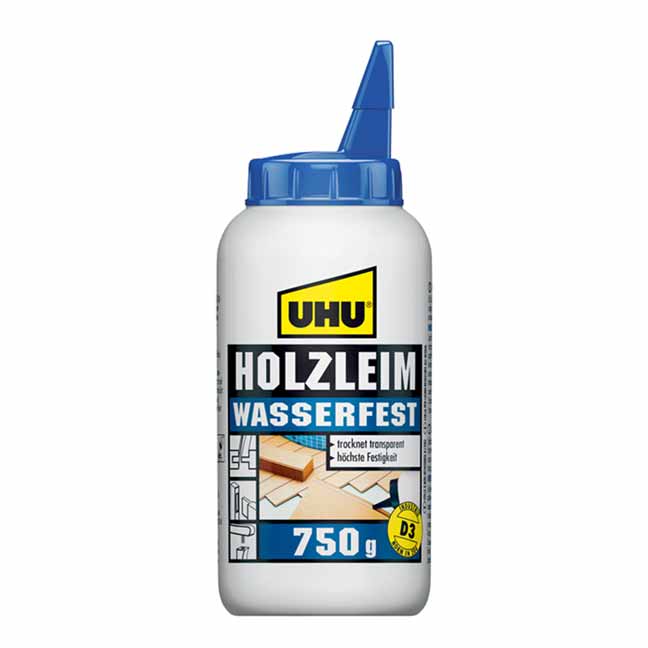 UHU Holzleim Wasserfest D3 750 g universeller und wasserfester Weissleim mit höchster Bindefestigkeit für alle üblichen Holzarten, Holzwerkstoffen und Schichtstoff-/ Holzverlegeplatten, trocknet transparent
