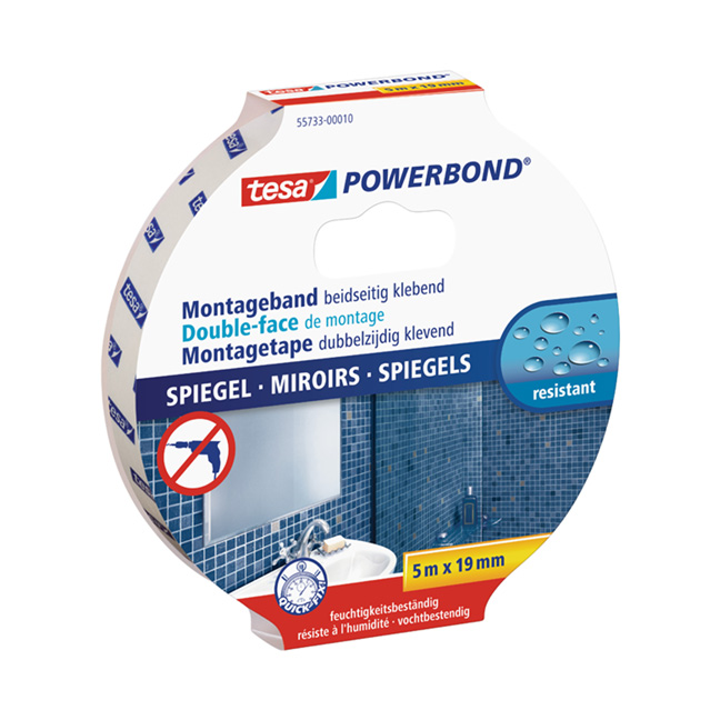 TESA Montageband Powerbond Mirror 19 mm 5 m Schaumträger mit Acrylatmasse, für ebene und leicht unebene Flächen geeignet, temperaturbeständig bis +80°C, feuchtigkeitsbeständig, ideal für Spiegel, Badezimmeranwendung wie Spiegel- und Accessoireanbringung, Anwendung in der Küche und in allen Feuchträumen
