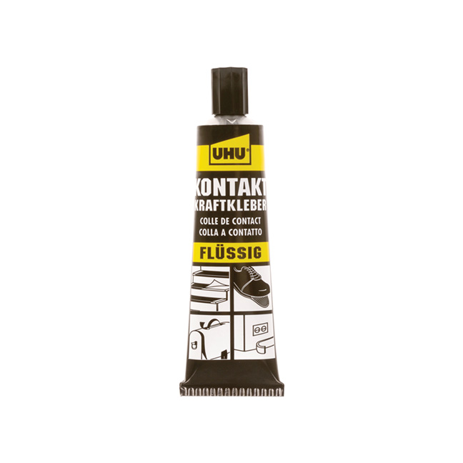 UHU Kontakt Kraftkleber flüssig 42 g flüssiger, universell einsetzbarer Kontaktklebstoff, der leicht verstreichbar ist und kräftige Kontaktklebungen ermöglicht, Materialien können nach der Klebung sofort weiterverarbeitet werden, stark und sauber, für extreme Belastungen, permanent elastisch, gleicht Materialspannungen aus, daher ideal für flexible Materialien