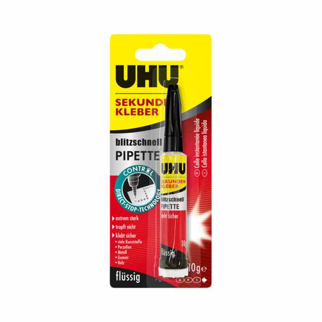 UHU Sekundenkleber blitzschnell Pipette flüssig 10 g SB glasklarer Einkomponenten-Reaktionsklebstoff auf Basis von Cyancrylat, der in Sekunden bis Minuten hochfeste Klebungen an zahlreichen Werkstoffen ermöglicht, hochfeste Klebungen bei den Metallen Stahl, Kupfer, Messing und Aluminium sowie bei duromeren und thermoplastischen Kunststoffen